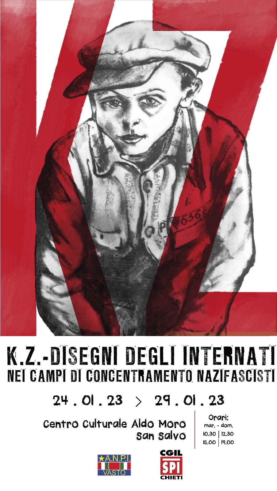 .La sezione ANPI “Vittorio Travaglini” di Vasto, in collaborazione con lo SPI CGIL di Chieti, in occasione delle attività previste per il Giorno della Memoria, ha organizzato dal 24 al 29 gennaio, presso il Centro Culturale Aldo Moro di San Salvo, la mostra “K.Z. Disegni degli internati nei campi di concentramento nazifascisti”. La mostra propone 130 disegni realizzati con mezzi e in condizioni di fortuna dai prigionieri di 13 nazionalità diverse nei campi di concentramento nazifascisti. L’artista e scrittore Arturo Benvenuti nel corso degli anni Settanta, dopo aver effettuato viaggi e lunghe ricerche li ha fotografati e raccolti nell’omonimo libro, dato alle stampe in una prima tiratura limitata nel 1983 (e successivamente ripubblicato), apprezzato, fra gli altri, da Primo Levi (che ne curò la presentazione), Nilde Iotti e Simon Wiesenthal.